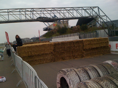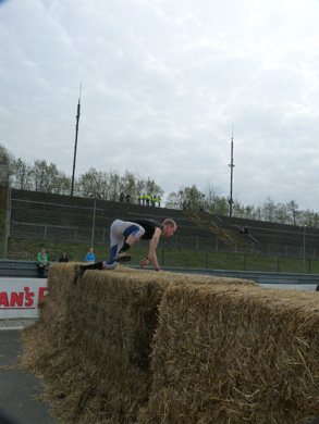 Dann bin ich an der Reihe, die Autoreifen sind kein Problem, aber beim ersten Strohballen rutsche ich direkt ab und muss neu ansetzten. Super Auftakt…