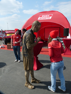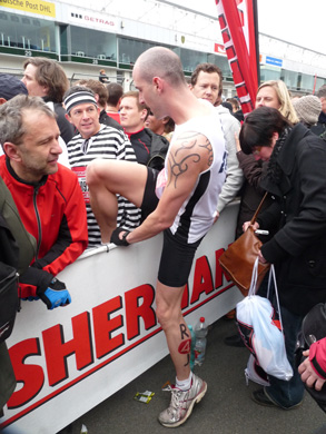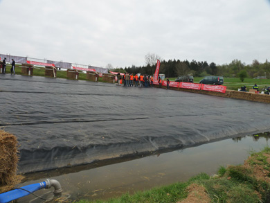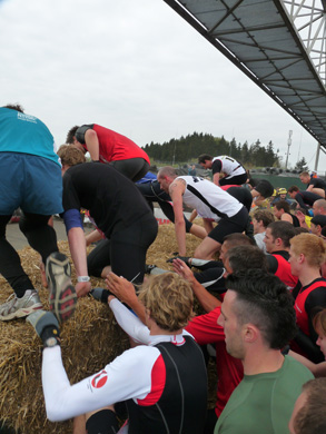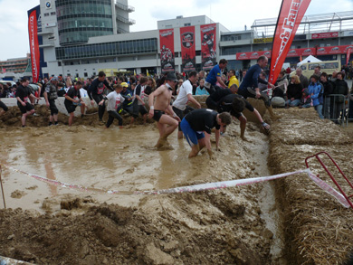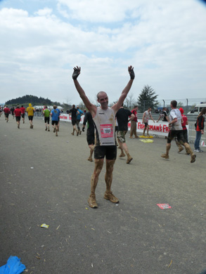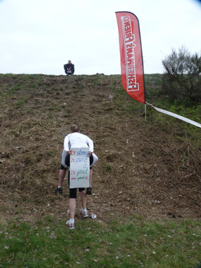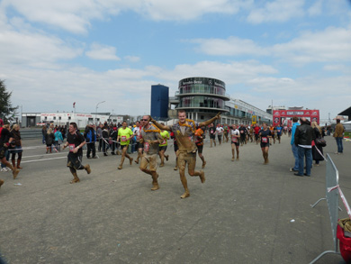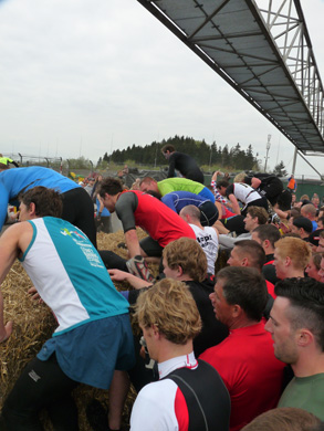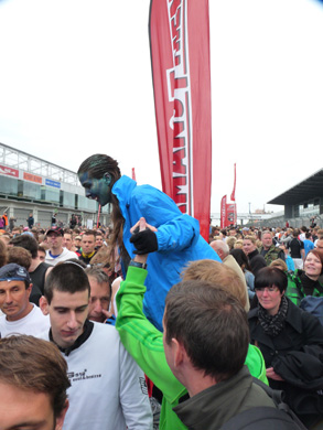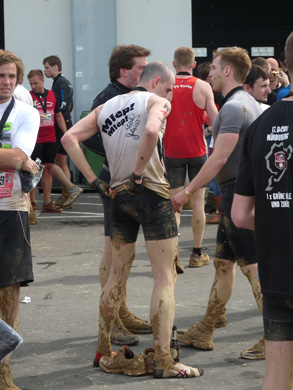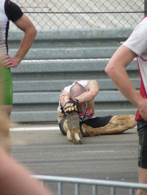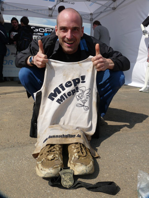 Mit ein paar kräftigen Sprüngen versuchte ich wenigstens etwas von dem Ballast abzuwerfen, aber ich erreichte damit nur, dass einige Zuschauer fieße Matsch-Spritzer abbekamen.