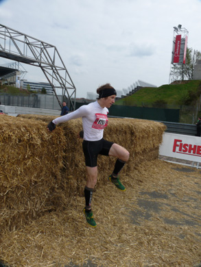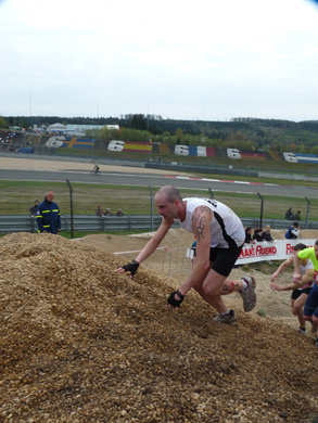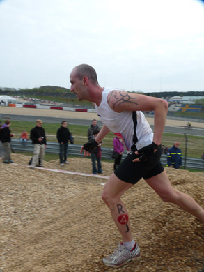 Ich versuche das ebenfalls, jedoch rutsche ich bei der Landung am Erdhügel ab, kann mich mit Mühe aber direkt vor den Augen der Strongman-Fotografen über die