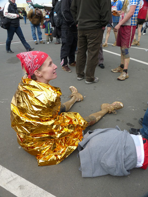 Ganz langsam schiebt sich der Tross auf fast 18.000 Beinen nach vorne. Die Räume zwischen den Körpern werden merklich größer und allmählich kann ich in einen ganz langsamen Laufschritt übergehen.