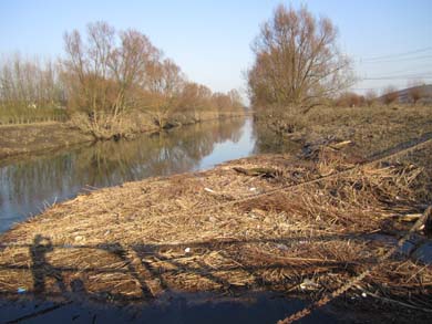 Da auch dieser Fluss bis vor kurzem noch erhebliches Hochwasser geführt hat, ist der kleine Trampelpfad in direkter Ufernähe noch ziemlich unpassierbar – jedenfalls im Laufschritt. Also heißt es auch hier wieder: Rauf auf den Damm – und welch‘ Überraschung? Es herrscht Gegenwind…