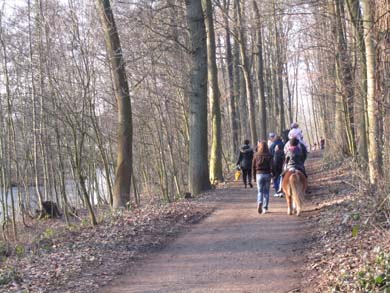 Auf diesem Damm geht es, wie gewohnt bei leichtem Gegenwind und immer in Sichtweite des Mühlenbaches, vorbei an der „Reuschenberger Mühle“ und schließlich rechts ab in Richtung „Tierpark Reuschenberg“ und „Gut Reuschenberg“, unter anderem ein Reithof. Dieses Teilstück führt mich über leicht ansteigende Waldwege zum Parkplatz des angrenzenden Friedhofes und schließlich einmal um selbigen herum.