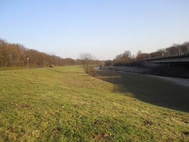 Flussaufwärts geht es direkt am Ufer weiter dem Zusammenfluss von Wupper und Dhünn entgegen. Ich überquere die Wupper abermals, diesmal auf dem Fussgängerteil einer Autobrücke und betrete den Mühlenbachdamm.