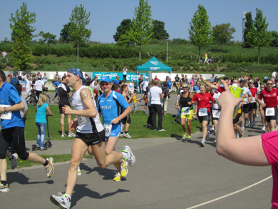 Der Refrather ließ den Stand sowie den Radfahrer rechts liegen, ich wollte mir zumindest einen Schluck Wasser gönnen und hielt mich weiter rechts. Beinahe prallte ich in den Radfahrer, griff nach einem Becher und verschüttete einen Großteil des Inhaltes auf mir, dem Radfahrer und den Getränkeposten. Den Rest flößte ich mir im Laufen ein.