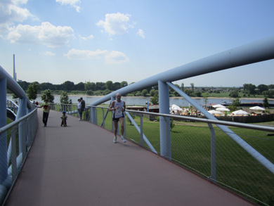 So erklomm ich den Rheindamm und direkt im Anschluss die Neulandbrücke. Beim Warmlaufen lache ich immer darüber, aber nach 13km im Wettkampftempo schaut das schon ganz anders aus.