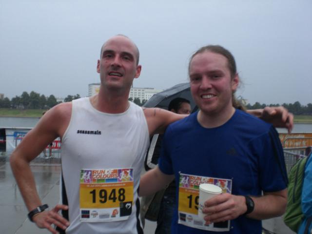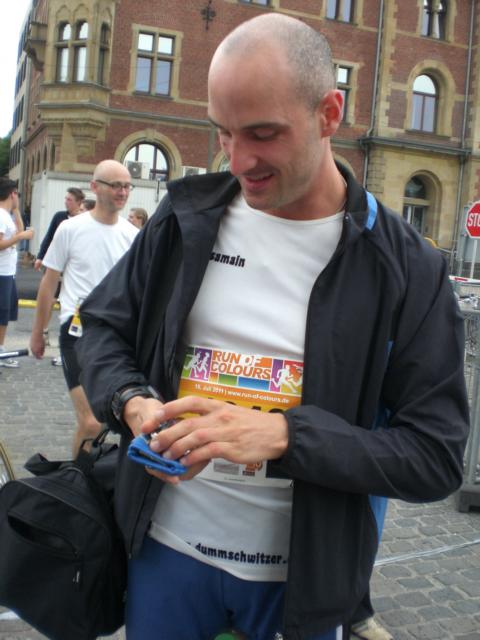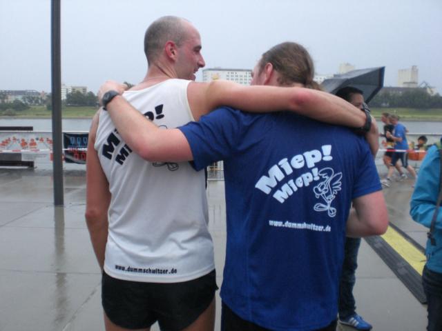 Kurz vor dem Warmlaufen und trotz des Wetters kam dann tatsächlich auch noch Nils vorbei. Es ist schon ein ganz anderes Gefühl so einen Lauf zusammen mit Freunden auf und neben der Strecke zu verbringen.