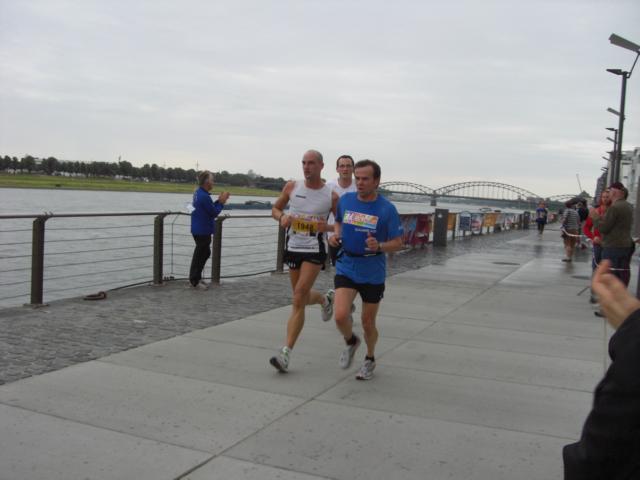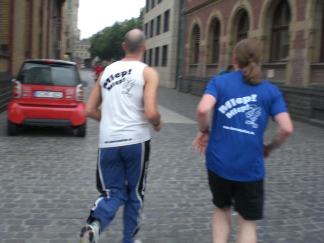 Kurzentschlossen lief ich neben ihm her. Noch im Rennen erzählte er mir schwer atmend, dass er sich die erste Runde mit einem anderen Läufer unterhalten hatte, dem wohl schon in Lerverkusen unsere Trikots (bzw: Meine Jacke) aufgefallen war.