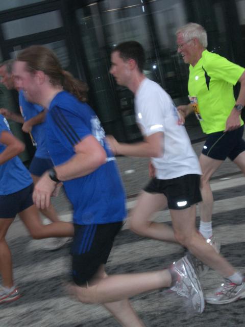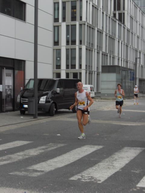 Ich riskierte einen Blick nach links in die verspiegelte Bürofassade – bloß nicht umdrehen und eine Schwäche zeigen! – und erspähte tatsächlich einen Läufer. Aber das war nicht mein ehemaliger Vordermann; der wurde jetzt scheinbar weiter durchgereicht, von jenen Läufern, die mit der 5km-Marke nochmal eine Schippe drauflegten.