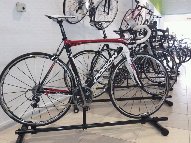 Eine ganze Wand des Showrooms ist für Rennräder reserviert und während wir beiden uns staunend umschauen, tritt der Mitarbeiter auf uns zu.